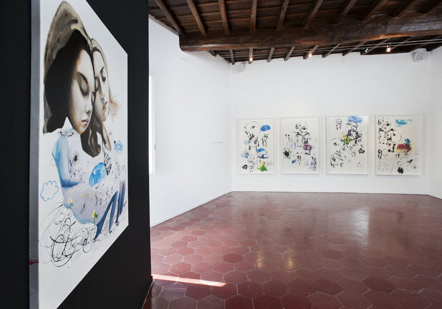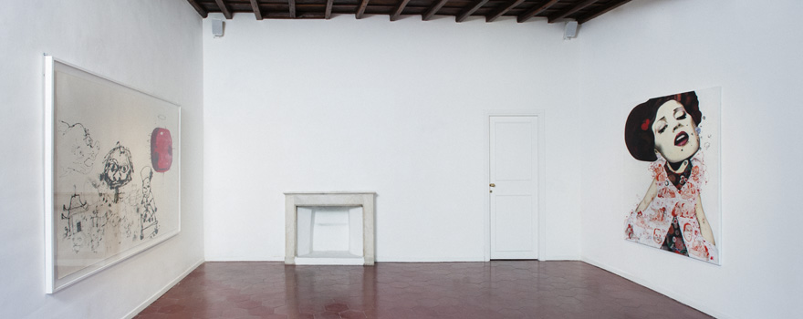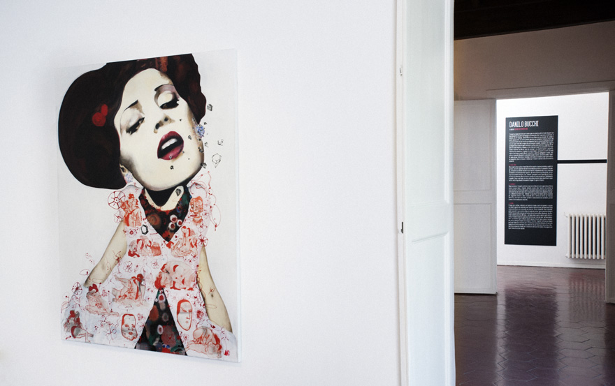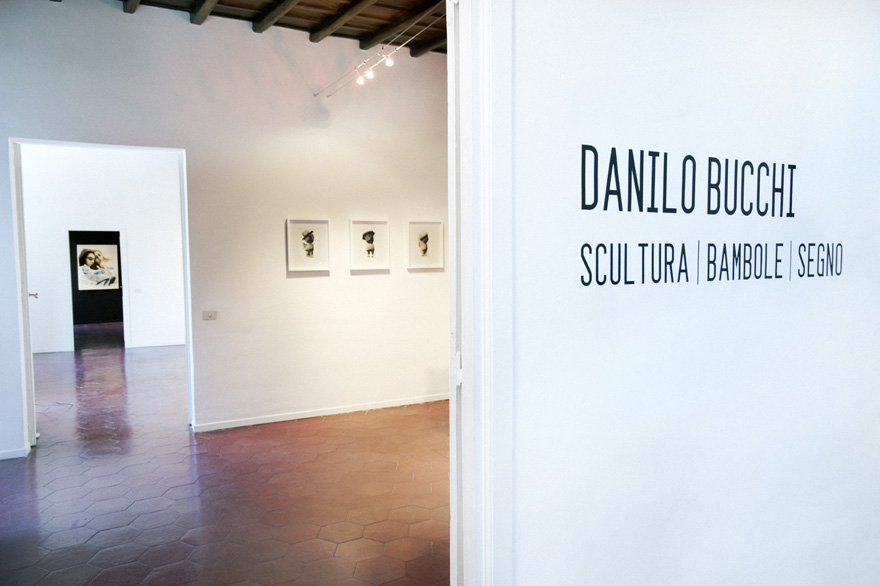 Tracing a black line, which flows like a path inside and beyond reality. Drawing an imaginative line, which starts from languages and goes through cities, experiences, interactions, memories, other languages… Danilo Bucchi is back in Rome with a solo exhibition which resembles the description above: a sort of diary collecting variously-sized portraits with a protean physiognomy, resulting from a metabolic process which involves the external world. Bucchi and his own multiplicity: the fluid sign of syringes replacing paintbrushes; dolls as favourite subjects of an almost theatrical body, sculpture as a new medium which is meant to broaden the horizons of language. Aluminium, paper and canvas are the metabolising surfaces of Bucchi's recitative figuration: a motionless dance involving his restless and pensive humankind, his volumetric self-portrait and his dolls, hybrid creatures between the Kabuki theatre and fabric puppets. Inside the concentric and immersive, floating and cosmic, evocative and recognisable worlds created by Bucchi, the real world undergoes a transformation: here the souls of the author, replete with suggestions from movies, comics, fashion and design, literature and technology, merge with each other– many souls whose genes blend together in front of their iconographical destiny, where references fade away and yield to the destiny of a new visionary identity.
