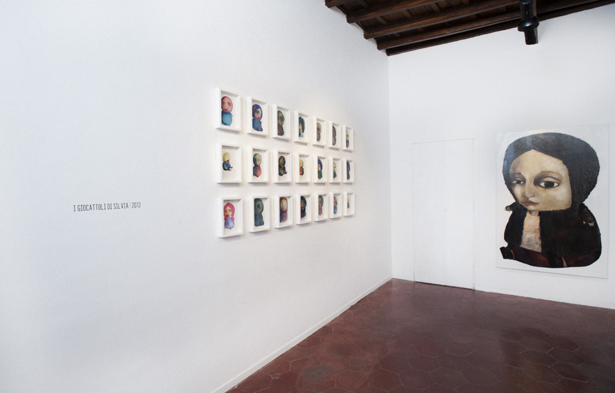 They represent an essential component in Bucchi’s artistic trajectory. Their pictorial presence embodies the playful and feminine dimension, through figurative codes which put the emphasis on the naturalness of their faces and the artificiality of their eyes. These melancholy dolls have awe-inspiring eyes and Beckettian faces, reminiscent of silent performances: they stare at us, revealing their mesmerising sensuality. They incarnate the “feminine” side of a highly emotional painting, permeated by inner suggestions and recognisable codes. Here the artist’s most meditative side emerges: the colours fill the perimeters, measuring the intensity of feelings and exploring moods and their sensorial modulation.
