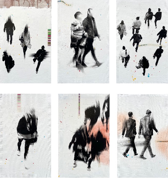 Gli spazi, all’interno delle opere, sono a volte luoghi del tessuto urbano, storici e identificativi, conosciuti, rassicuranti dove le persone stanziano in una comfort zoneo si muovono in relazione tra loro, altre volte sono non-luoghi quasi irreali, senza punti identitari o di riferimento, dove le figure lasciano lo spazio all’astrazione, in un’atmosfera liquida, universale, sospesa, onirica, un’apnea di respiro che parla del nostro tempo. In tutte le opere si percepisce un dinamismo forte, composto da elementi discordanti, ma allo stesso tempo in perfetto equilibrio, una spinta che ti porta dentro la tela, alla ricerca di quel posto da occupare con il proprio bagaglio personale, la visione dell’artista che si trasforma in fruizione attiva dello spettatore.
